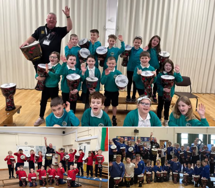 Last Week Jonny Baxter our First Experience tutor visited many schools in Denbighshire, here we have Years 2,3 & 4 learners from Ysgol Henllan, Year 3 learners from Ysgol Frongoch, and Years 3,4,5 and 6 leaners from Ysgol Bryn Clwyd enjoying the African Djembe Drumming workshops. Well done everybody, hope you all enjoyed the sessions, looking forward to seeing you all again next year. Have a lovely Christmas.